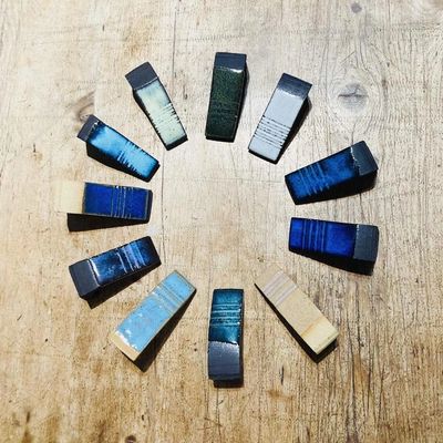 Session 2 - You and your partner will evaluate your line blends, and select the blend that functions best as a glaze. You will then mix this blend at a larger scale, and use this base glaze to develop colours, using tester tiles and adding various percentages of colouring oxides such as red iron oxide, rutile, cobalt carbonate, copper carbonate, manganese dioxide, chrome oxide, illmenite, titanium dioxide and tin oxide / zircopax, as well as artificial stains.